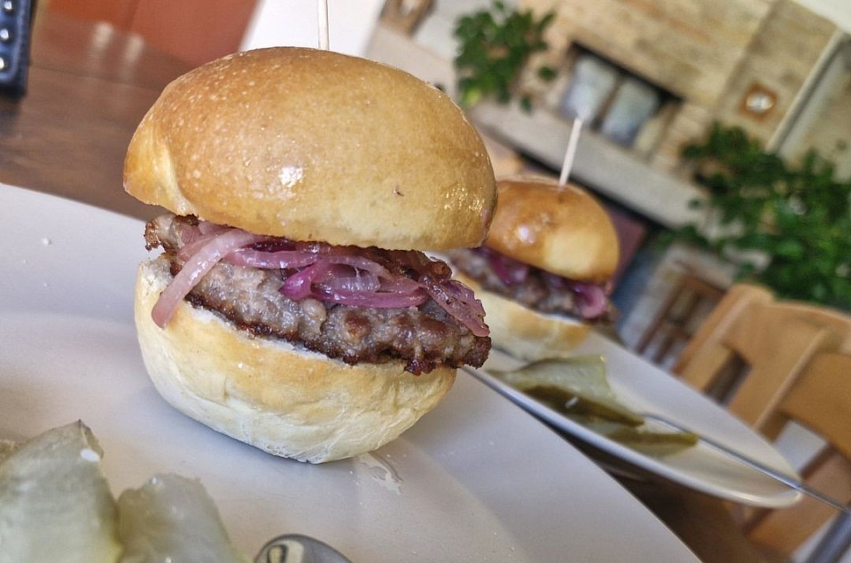 Panino al latte fatto in casa con hamburgherino di pastin, cipolla caramellata e salsa speziata